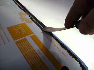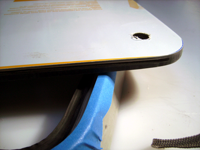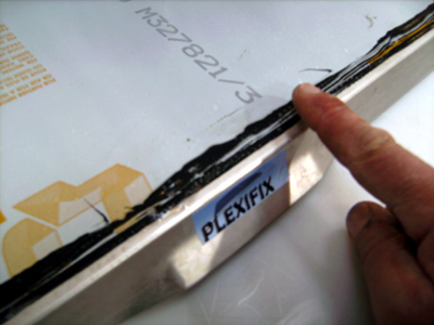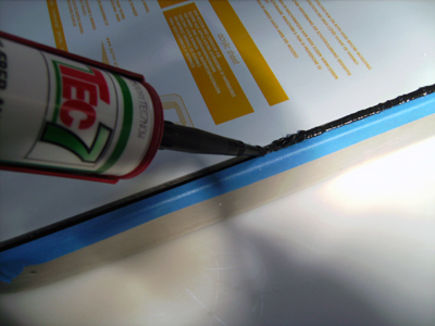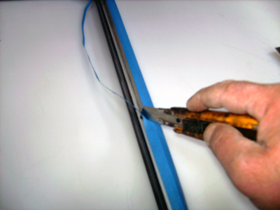 Aluminiumsrammen afrenses for lim og fuge rester. (Det er lettest at skære fugen helt væk og herefter slibe med korn 100 indvendigt i rammen). Afdækningstape påføres oversiden af rammen og renskæres.
